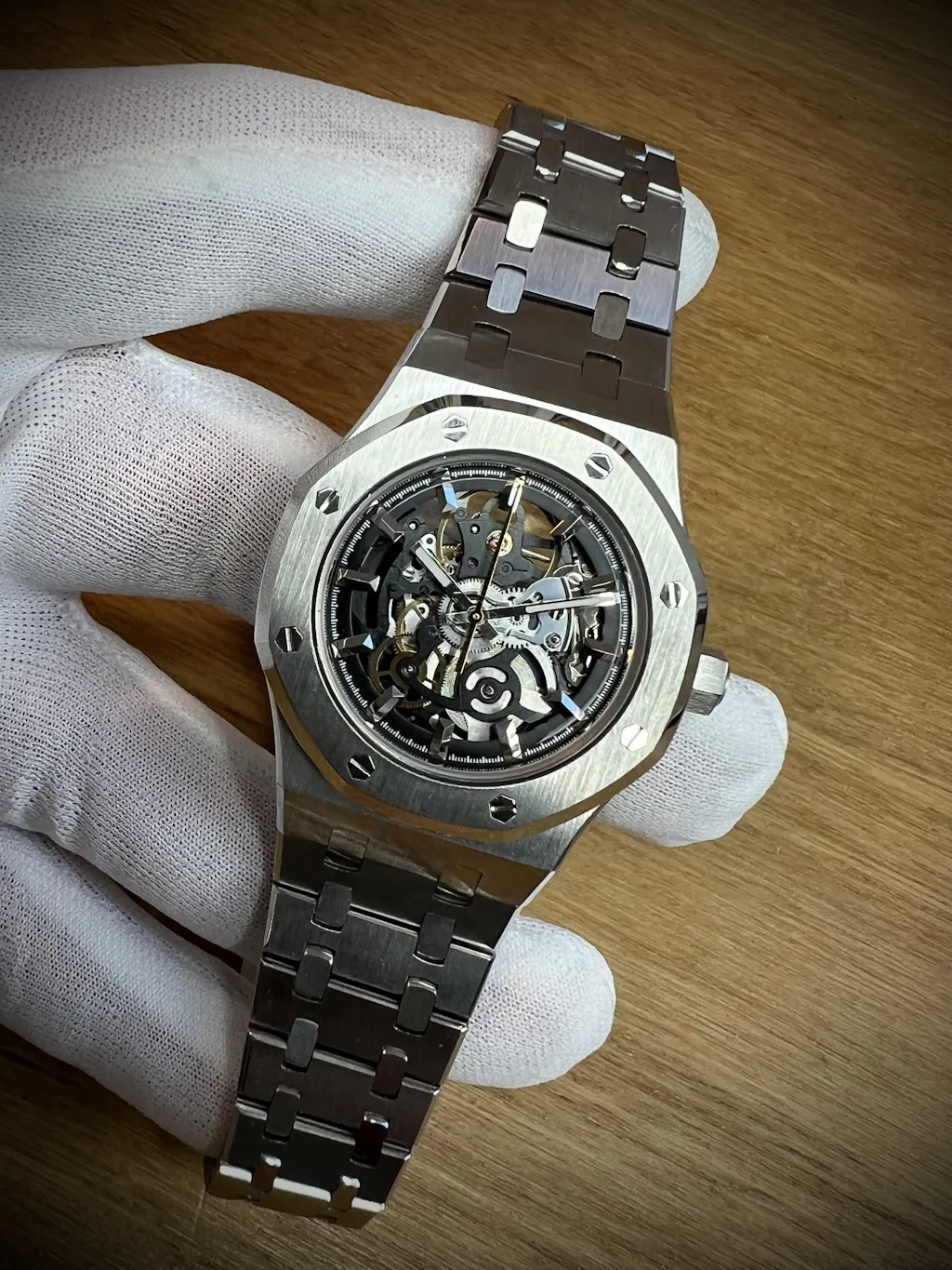 The Royal Oak 37 mm NH72 Skeleton is built around a fascination with mechanics and proportion. The open-worked NH72 movement is left fully exposed, allowing the structure and motion to speak for themselves. A sapphire crystal with a flat exterior and domed underside draws light into the movement while keeping the watch slim and well balanced on the wrist. Carefully assembled and refined with intention, it’s a skeleton Seiko mod focused on clarity, restraint, and respect for the craft.
